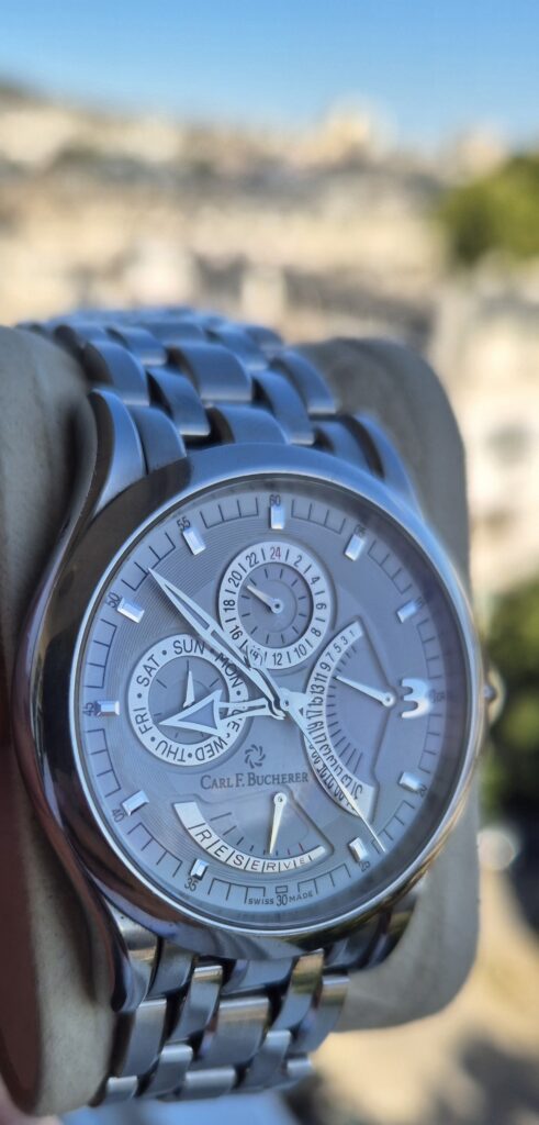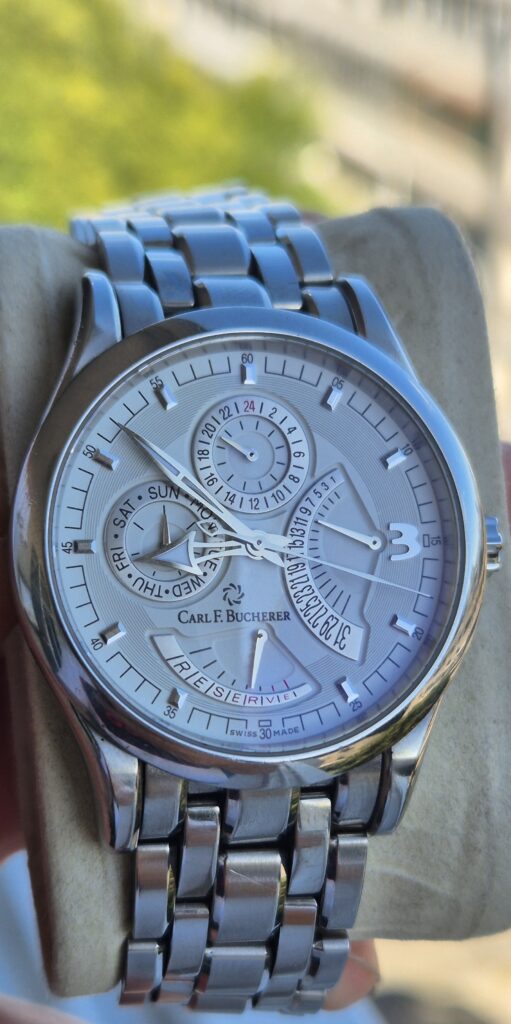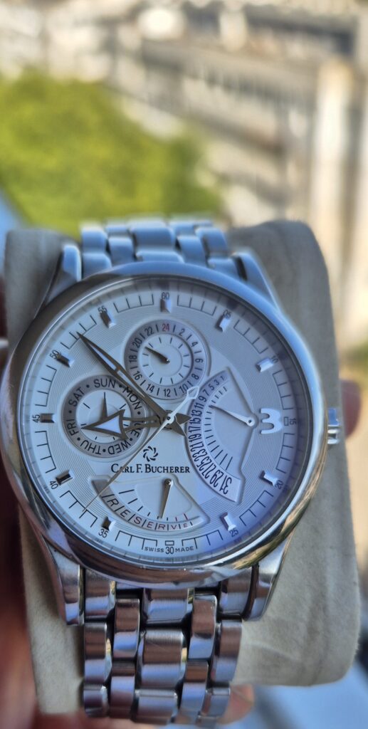 Montre très belle et élégante, riche en détails et dotée de nombreuses fonctions : indicateur de réserve de marche, jour, date rétrograde et sous-cadran 24 h.