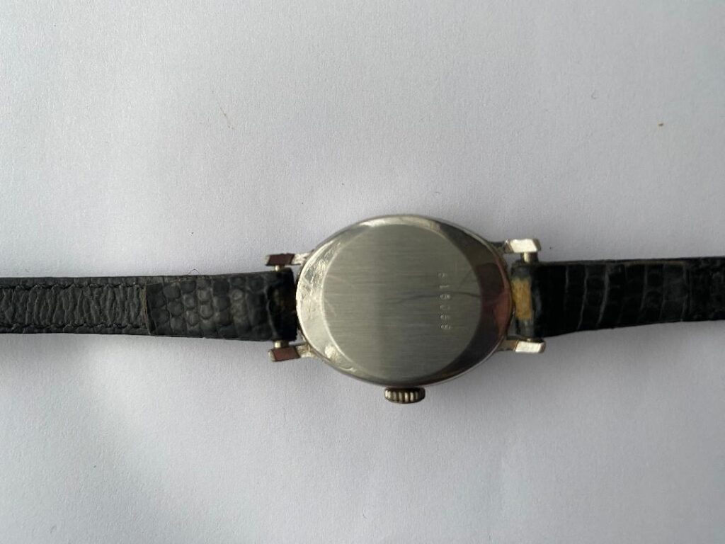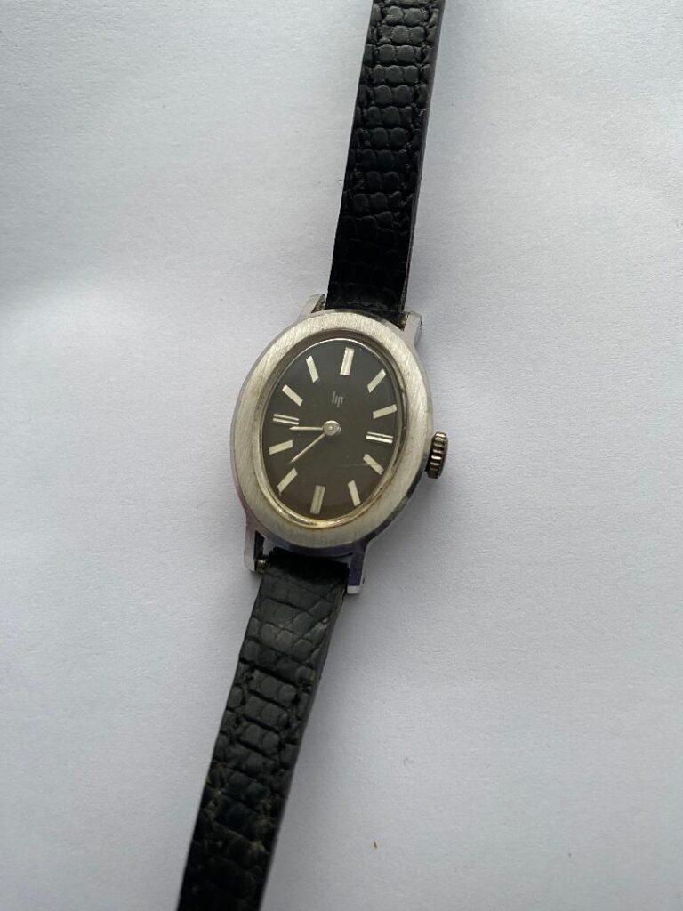 Ancienne montre Lip femme numérotée de la fin des années 1960, cadran de forme ovale argent, fond noir et chiffres romains argentés, bracelet en cuir noir.