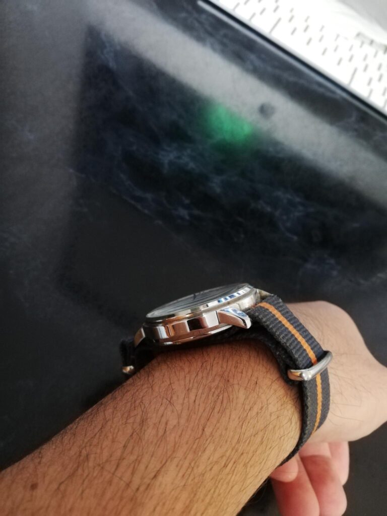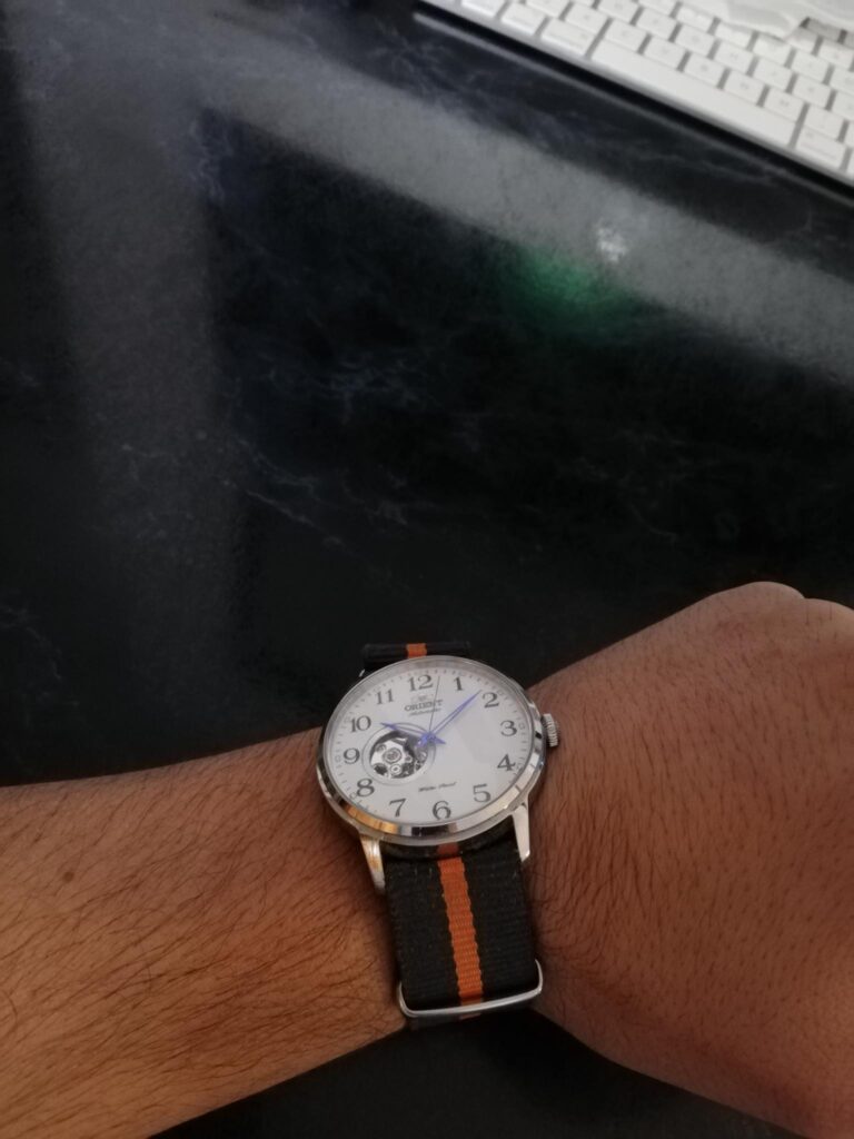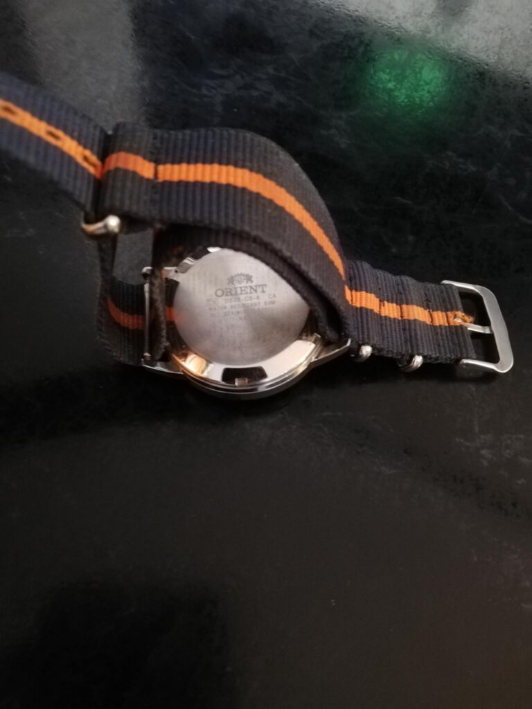 Montre Orient Esteem montée sur bracelet Nato Orange et Bleu nuit.